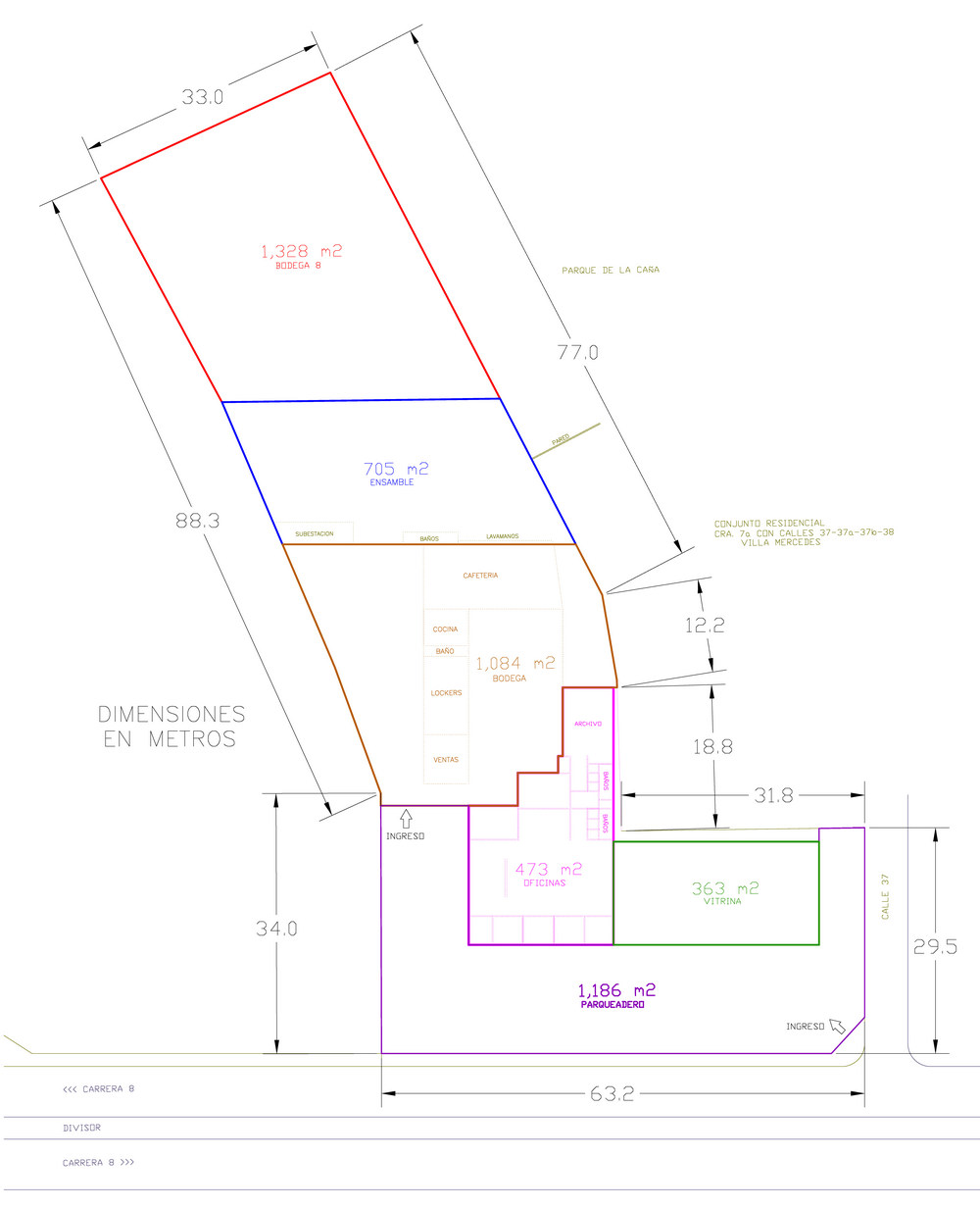 Fachada de 63 Metros sobre la Carrera 8a, arteria principal con "Corredor Verde"